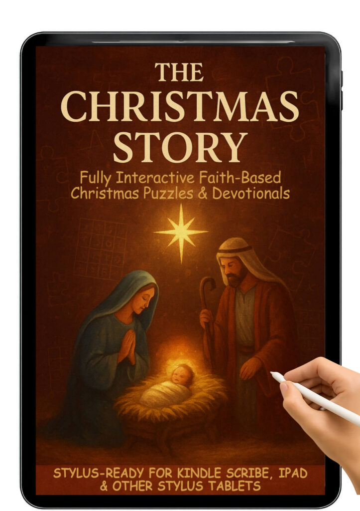 Experience the true meaning of Christmas through this beautifully crafted, fully interactive puzzle book. Every page is hyperlinked and stylus-ready for Kindle Scribe, iPad with GoodNotes, and other tablets—making it easy to enjoy Scripture-based puzzles, devotionals, and meaningful moments of reflection. A relaxing, faith-building way to celebrate the season and draw closer to Jesus.